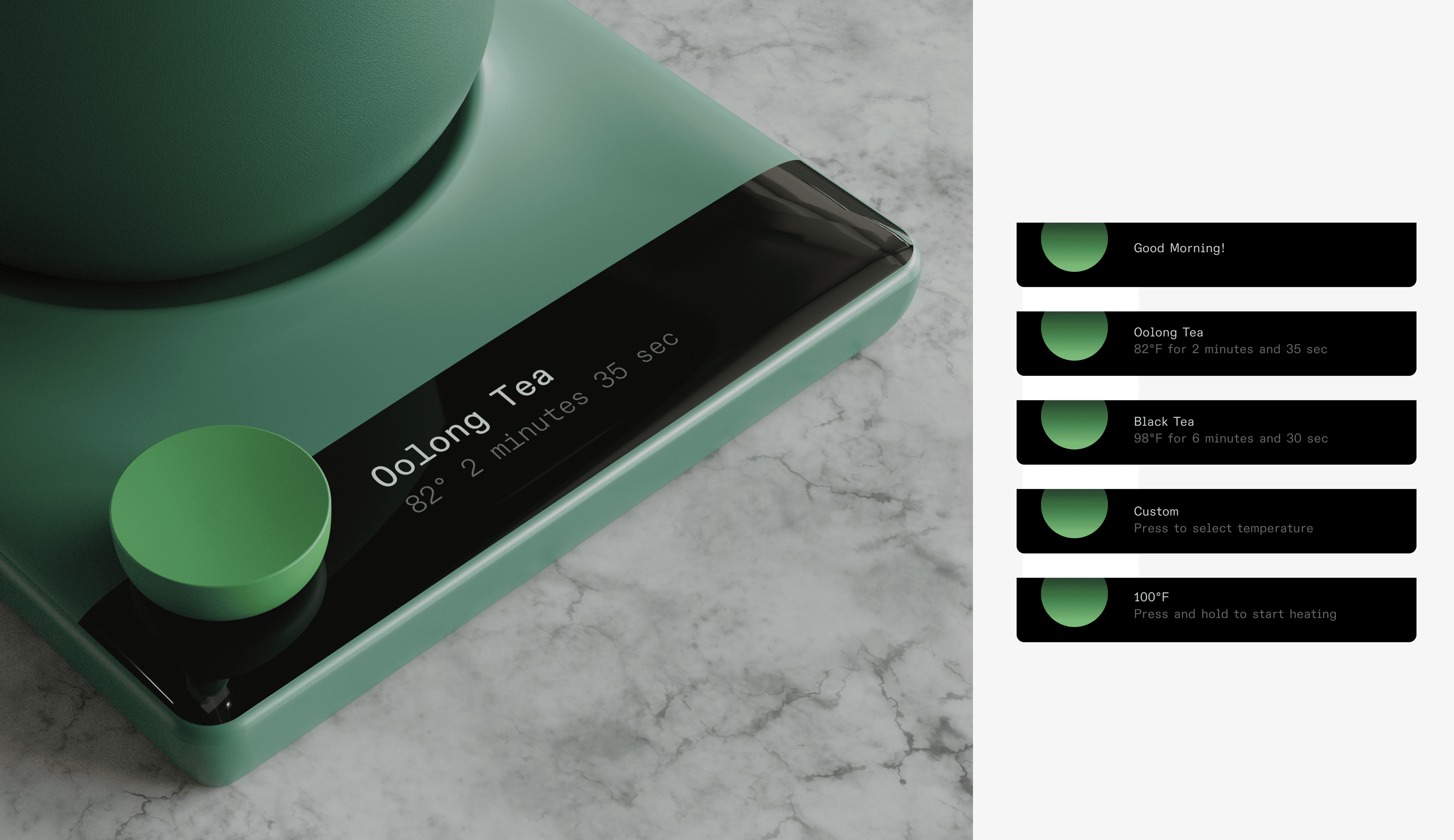 Umalog has a, intuitive, aesthetically pleasing UI, allowing the user to control the preloaded temperature presets by twisting and pushing down on the dial. Additionally, the user can set their own custom temperature at the end of the preloaded menu.