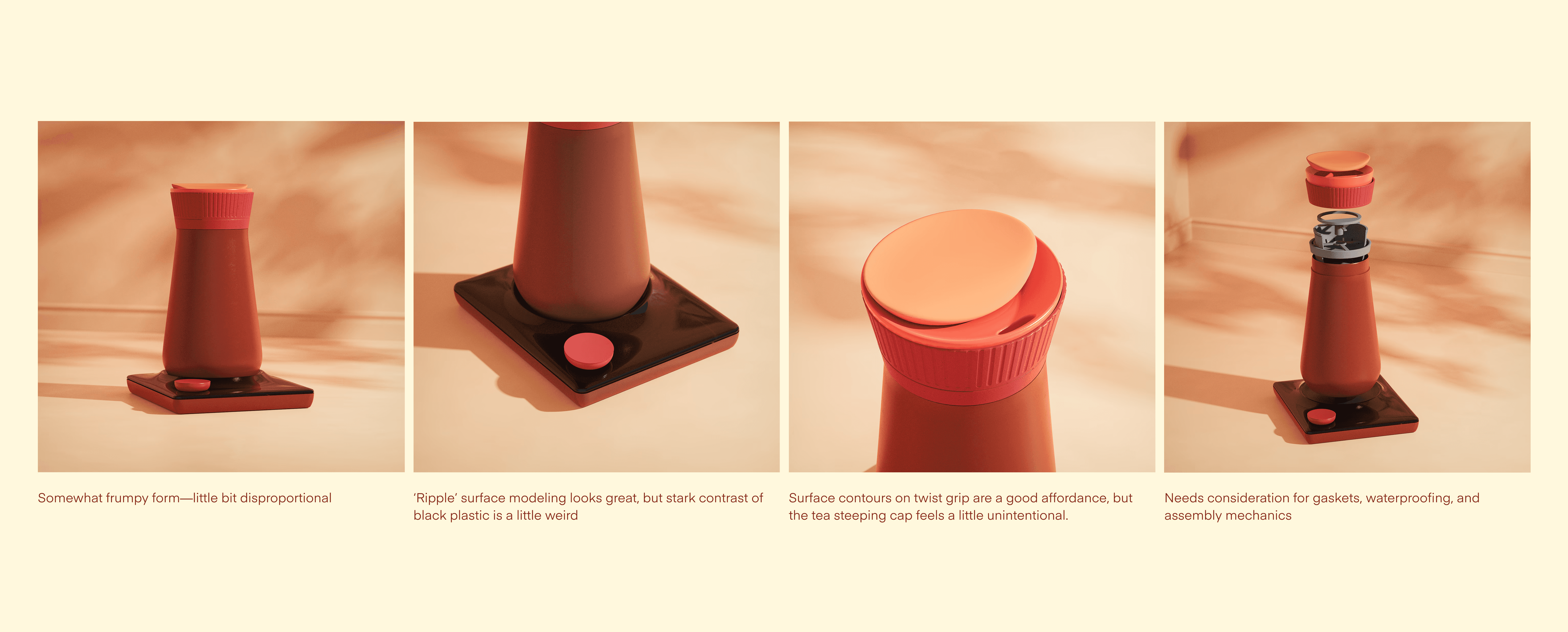 We also paid special attention to the mechanics of Uma's tea steeping basket, making sure there were plausible solutions for assembly, gaskets, materials, and watertightness.