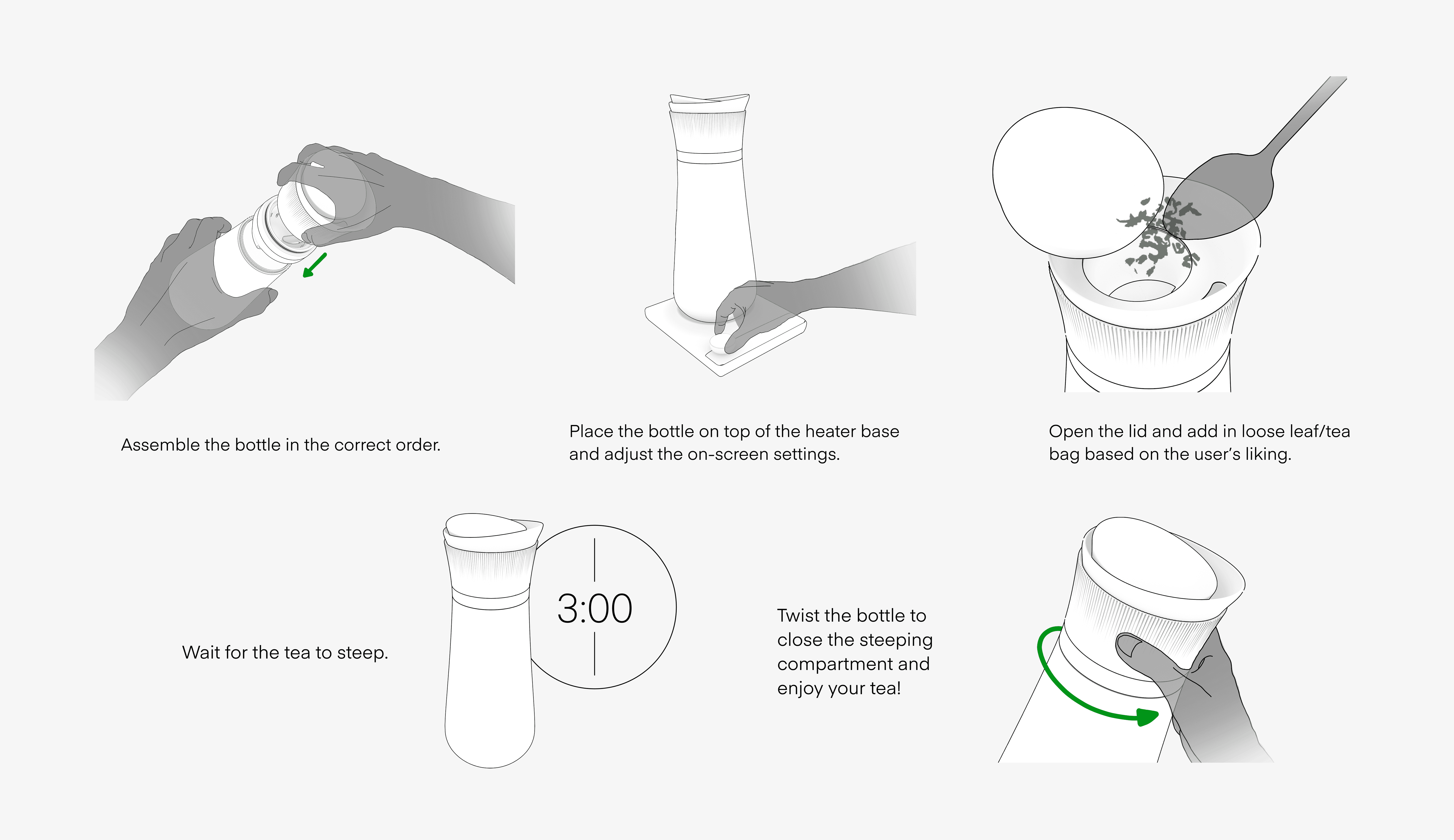Through thorough user research, including in-depth task analysis and multiple more interviews, we ascertained five main pain points of the on-the-go tea brewing experience.